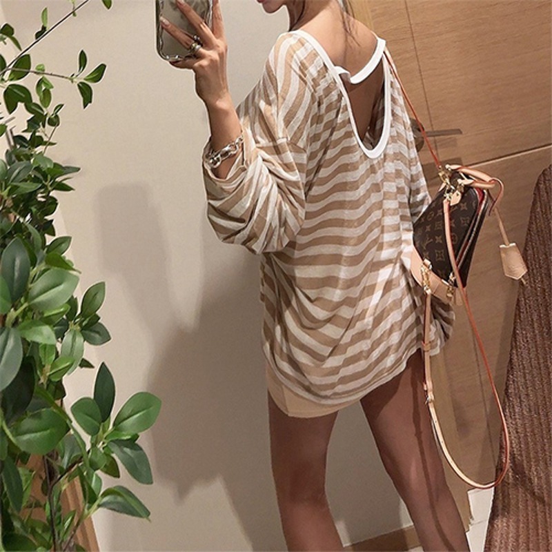 루디 단가라티 (데일리/캐쥬얼/빅사이즈/여름/썸머/바캉스/휴양지/봄/가을/간절기/배색/단가라/오버핏/얇은/박시/긴팔/소매트임/티셔츠)