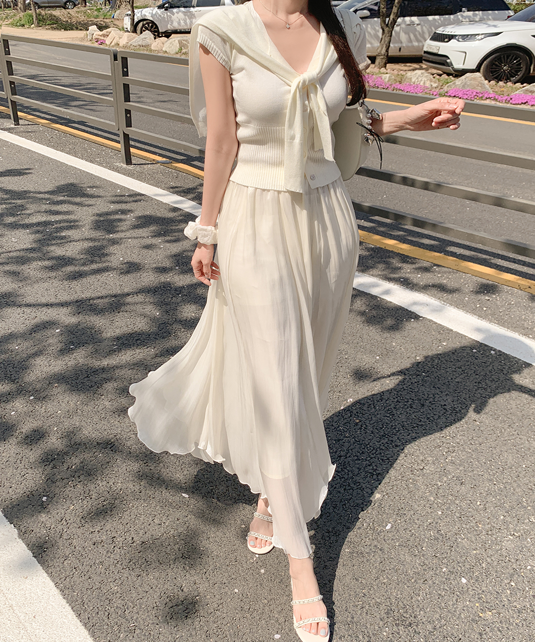 본니르 새틴 펄 밴딩 플레어 롱 스커트