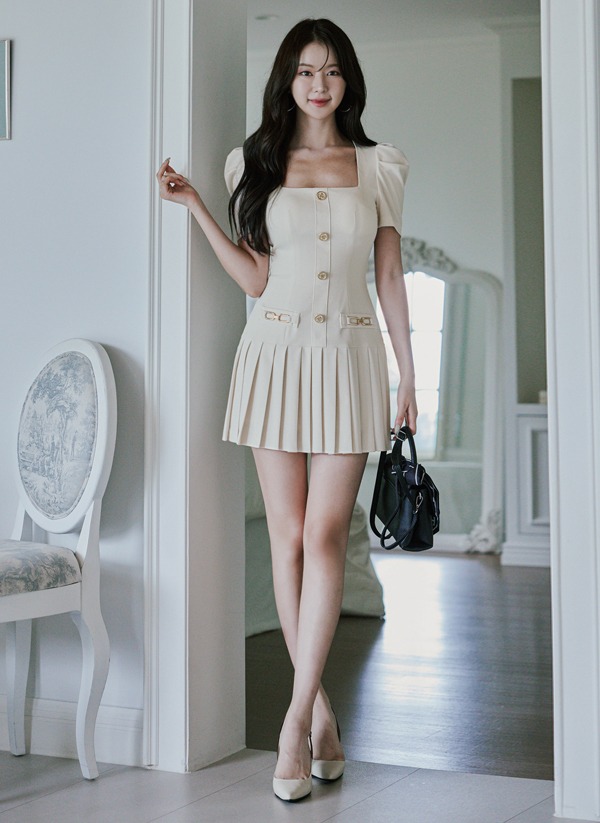 두어즈 퍼프 스퀘어넥 플리츠 미니 원피스