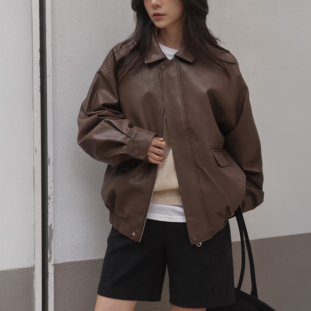 [단독] 리도어 카라 집업 레더 자켓 (가을/간절기/래더/블루종/가죽재킷/점퍼/아우터/오버핏/박시핏/빈티지/브라운/블랙/모카무스)