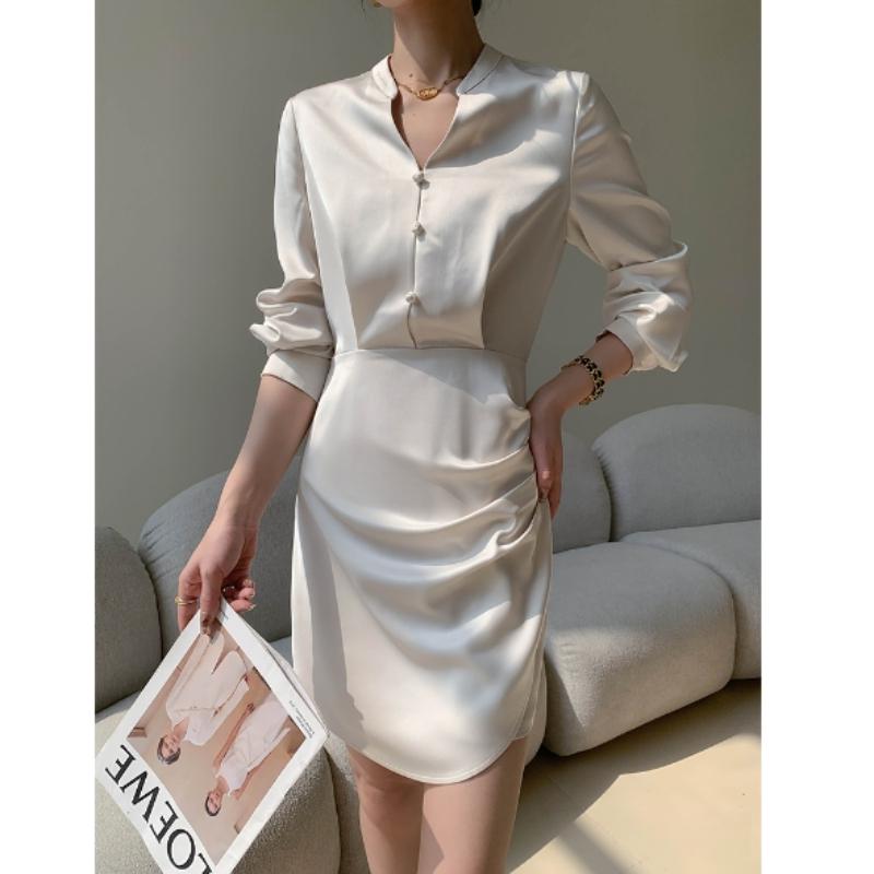 새틴 원피스 드레이프 콩단추 예복 결혼식 하객룩 부케받는옷 면접복장