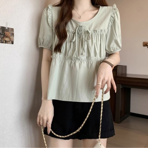 빅사이즈 반팔블라우스 봄여름 셔츠_ 여름 데일리 라운드넥 리본 통통 상체비만 블라우스 퍼프소매 벌룬 반팔 셔츠 프릴 셔츠_ 빅사이즈룩 반팔 티셔츠 귀여운옷