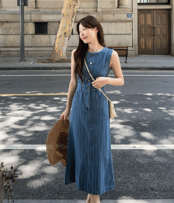 크로쉐❤️라운드넥 버튼 포켓 A라인 데님 뒷트임 스트라이프 롱 원피스 1color