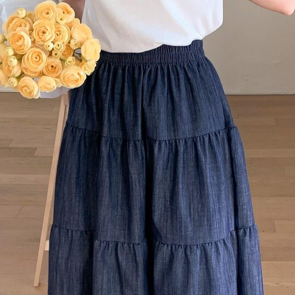 로토러 청치마 밴딩 프릴캉캉 여성 긴치마 논페이드데님