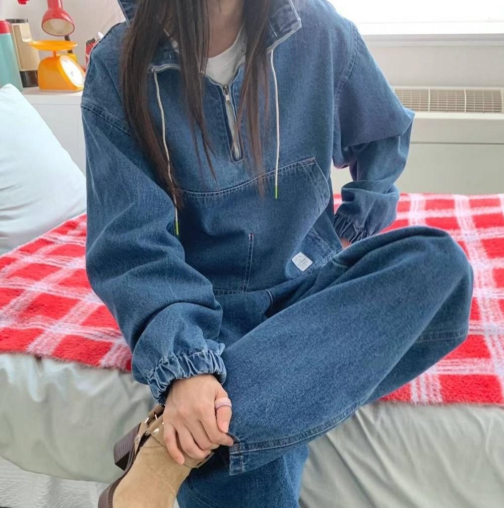 하이넥 반집업 스트링 배색스티치 캥거루포켓 긴팔 데님 숏 아노락 점퍼