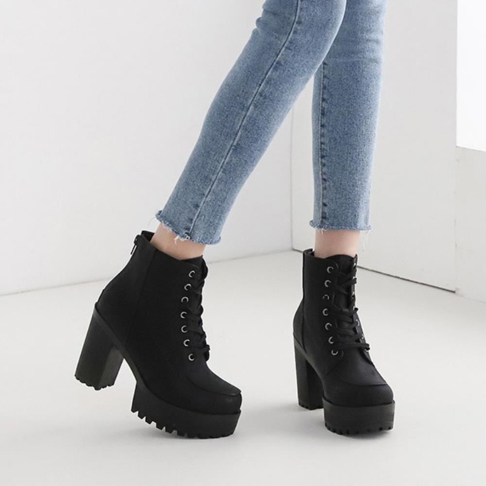 엔디오 발목 여성 레이스업 통굽 가보시힐 하이힐 블랙