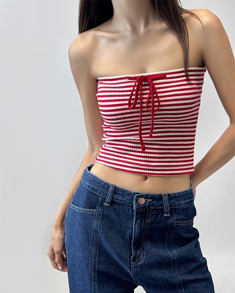 [흘러내림X] 벨라 스트랩 리본 스트라이프 단가라 골지 세미 크롭 튜브탑 (4컬러)