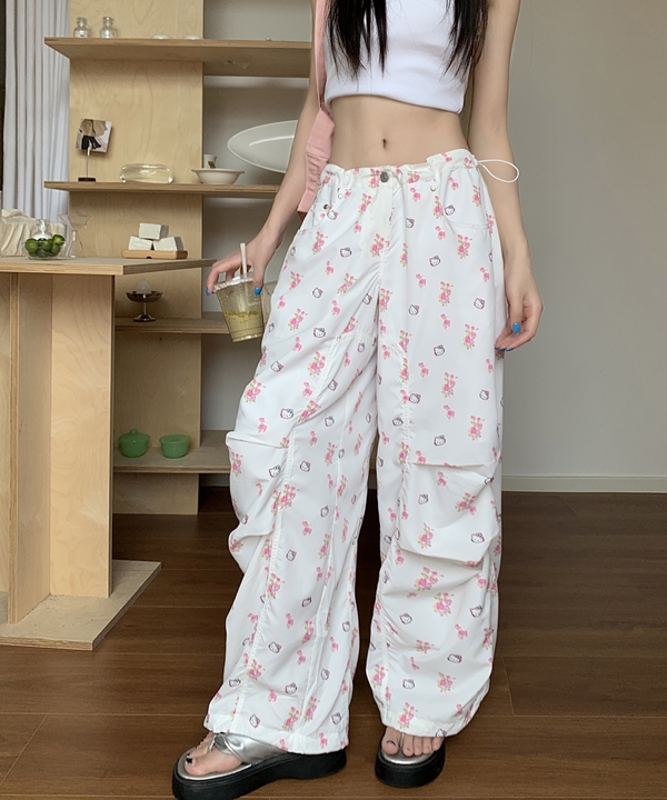 [키치&힙/발레코어]츄잉 플라워 프린팅 바스락 허리 스트링 파라슈트 와이드 팬츠
