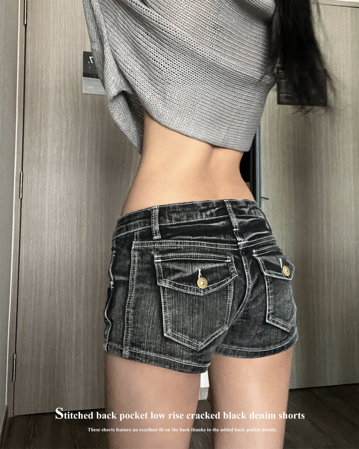 스티치 백 포켓 로우라이즈 크랙 블랙 데님 반바지 (Denim)
