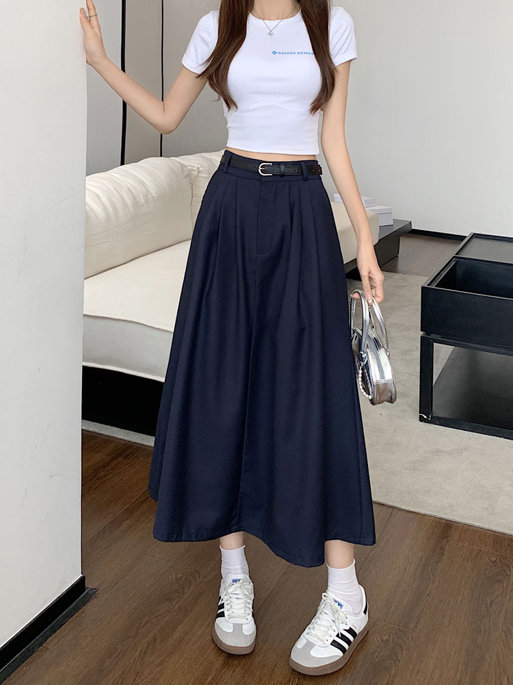 하이웨스트 핀턱 A라인 베이직 벨트 세트 플레어 롱스커트 LY324051