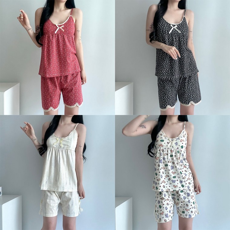 리본 레이스 끈 나시 투피스 잠옷 동물 꽃 패턴 여성 여름 모달 파자마 홈웨어 집순이 면 반바지 울랄라 반팔 여자 학생 실크 냉장고 로브 인견 자주 원피스 실내복 레이온 공주 5부