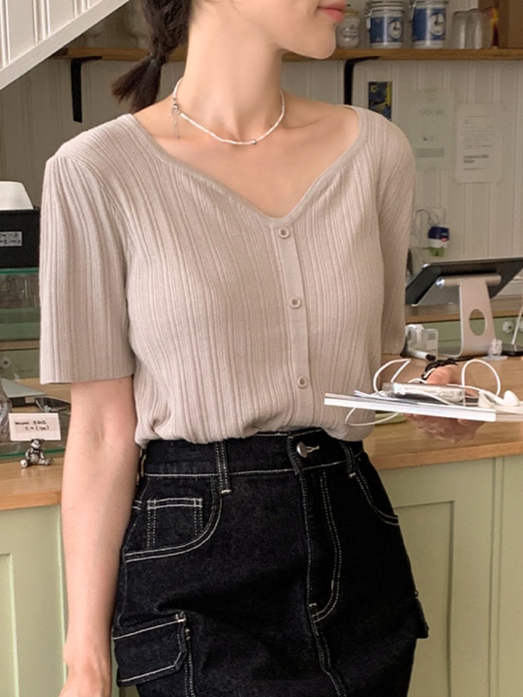 [44-120] 헨터닝 골지 스판 브이넥 셔링 세미크롭 니트( 여름-데일리룩-데이트룩-캐주얼룩-캠퍼스룩-하객룩-격식룩-출근룩-빅사이즈-120사이즈-자체제작-시원한-가벼운-통통녀-반팔니트 )
