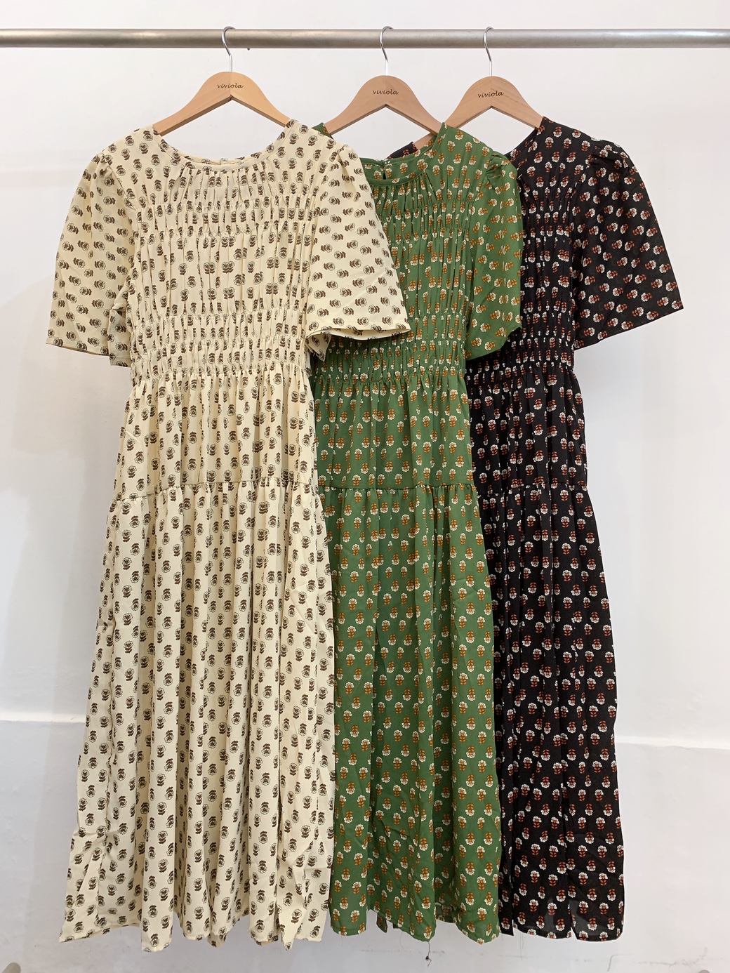 도토리 반팔 라운드넥 스모크 밴딩 패턴 롱 원피스