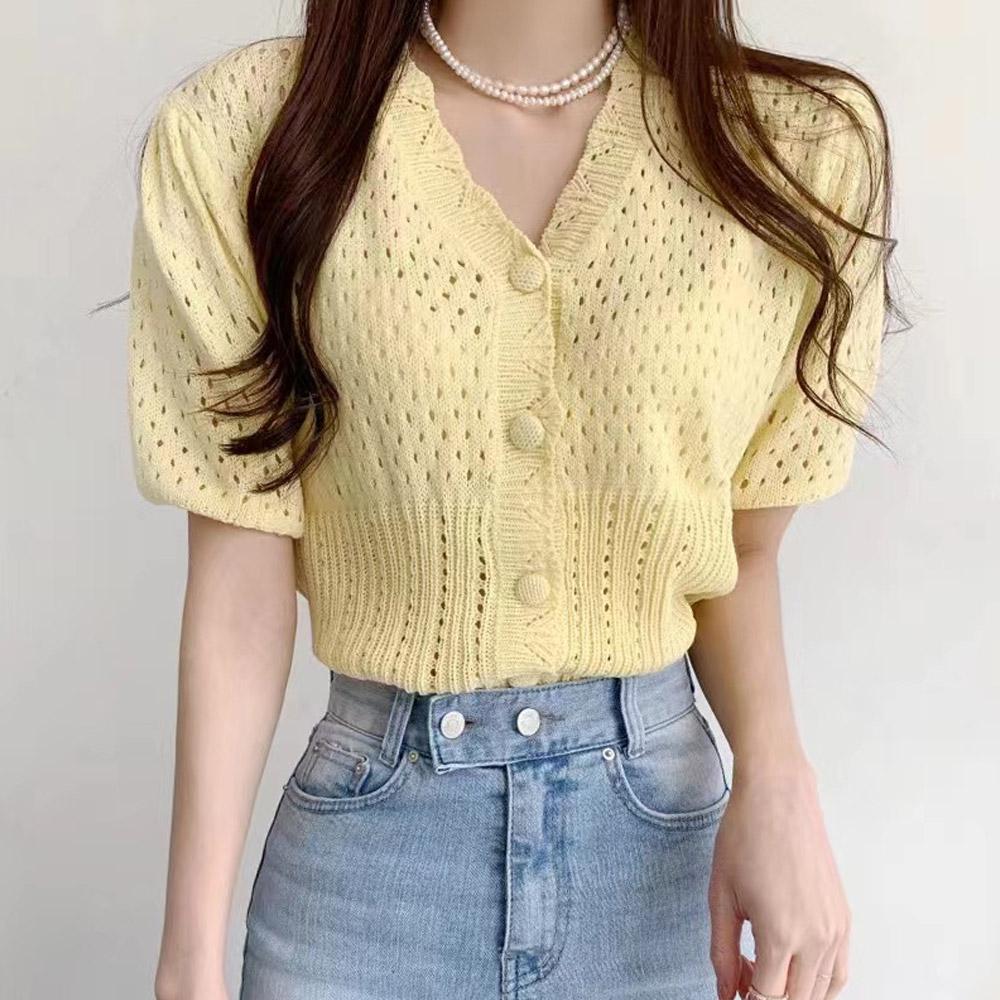밀리탕 여자 버튼 니트 스모크 블라우스