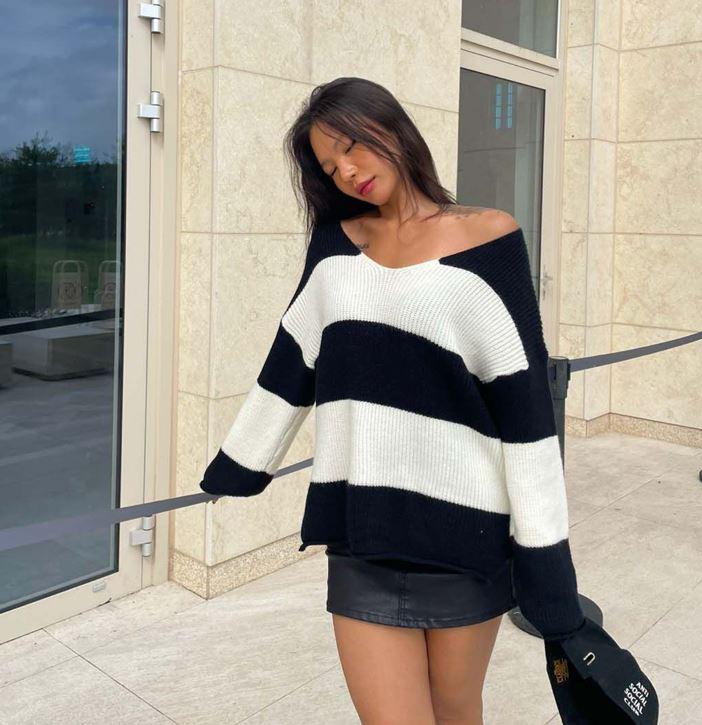 뉴욕 오프숄더 V넥 단가라 스트라이프 루즈핏 가을 레이어드 긴팔 스웨터 롱 니트 5컬러