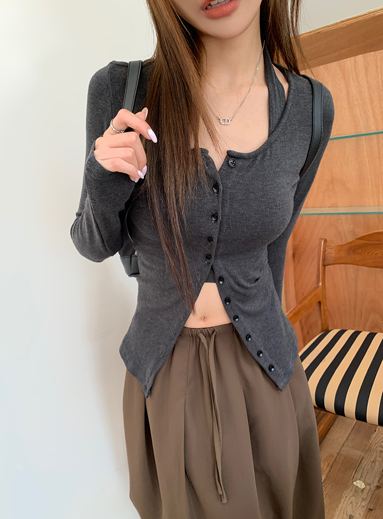 [데일리룩/힙한코디] 가을 슬림핏 홀터 나시 버튼 가디건 티셔츠 세트