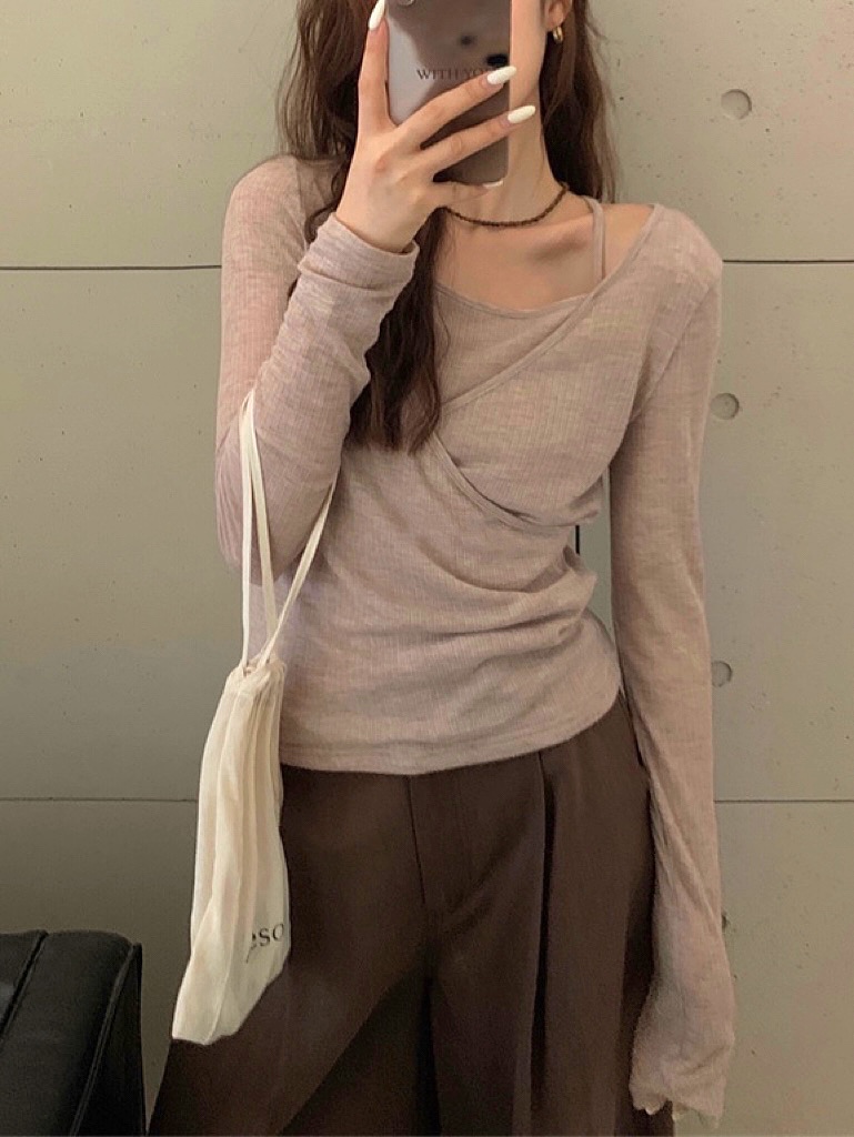 [여리여리핏/발레코어룩] 온비 유넥 슬리브리스 랩 시스루 골지 긴팔 이너 레이어드 홀터넥 티셔츠