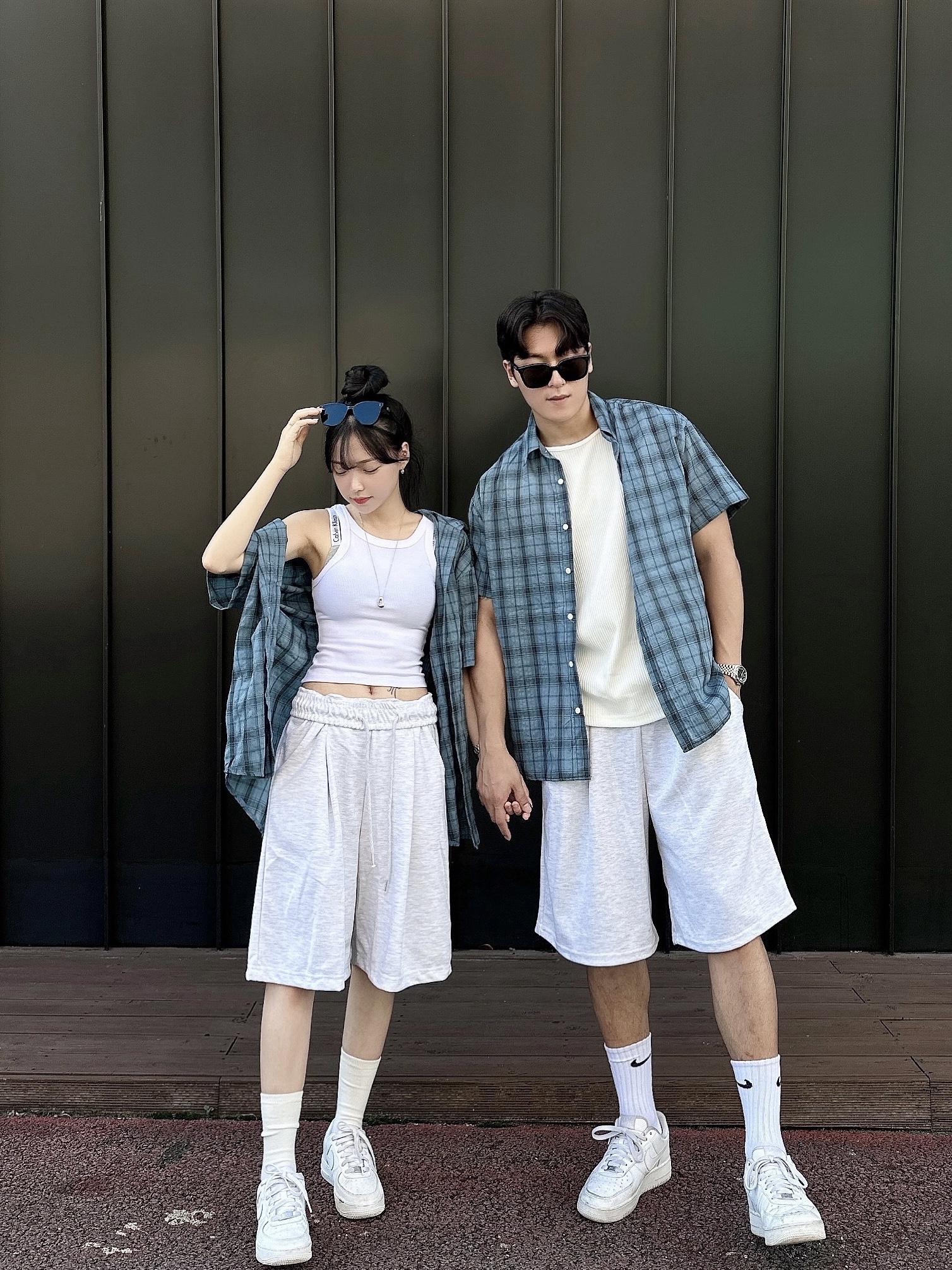 세트가능! 오버핏 체크셔츠 반팔 셔츠 남녀공용 스트릿 반팔 여름 커플룩 커플티 루즈핏 반팔 티셔츠 핀턱 버뮤다 팬츠 밴딩 반바지 꾸안꾸 트레이닝세트 커플 시밀러룩 빅사이즈 힙 코