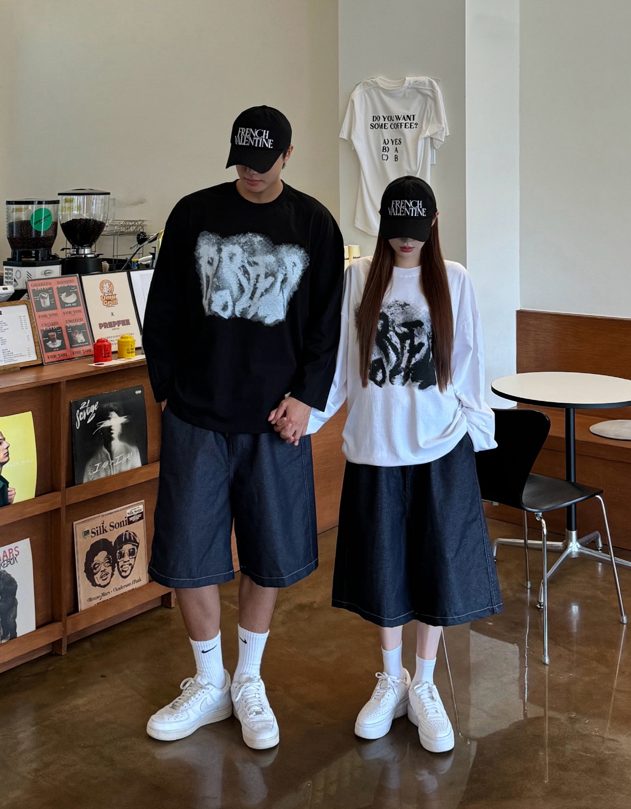 *가을신상[4컬러/세트가능] 남녀공용 긴팔 오버핏 레터링 빅사이즈 티셔츠 데님 버뮤다 밴딩 팬츠 트레이닝 세트 커플룩 시밀러룩 데이트 간절기 맨투맨 꾸안꾸 힙 스트릿