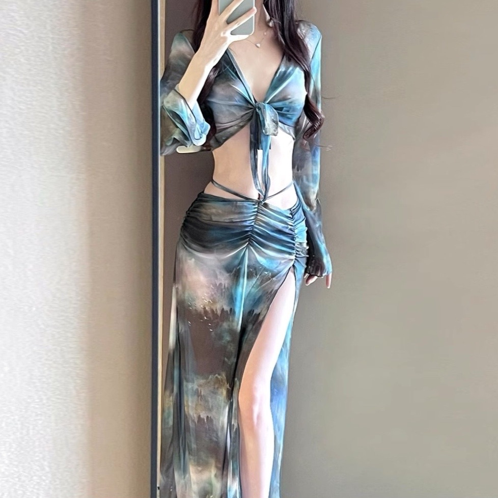 [고퀄리티/4피스set] 퍼시픽 그라데이션 물 나염 수영복 비키니 커버업 가디건 스커트 비치 원피스 세트