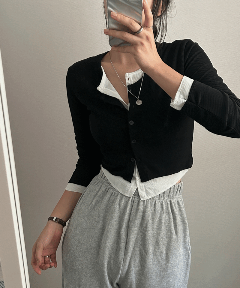 [4color/일체형~] 레이어드 이중 크롭 라운드 슬림 가디건 티셔츠