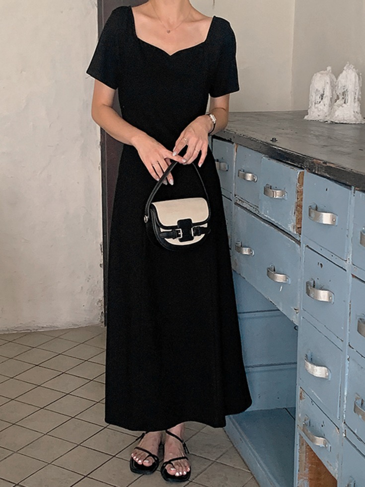 [44-120] 하즈빈 하트넥 라인 플레어 롱 원피스 ( 여름-데일리룩-데이트룩-캐주얼룩-캠퍼스룩-하객룩-격식룩-출근룩-빅사이즈-120사이즈-자체제작-체형보정-가벼운-통통녀-여름하객룩-반팔원피스 )