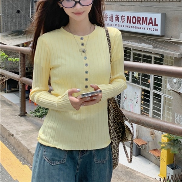 카산 슬림핏 골지 버튼 라운드 긴팔니트탑