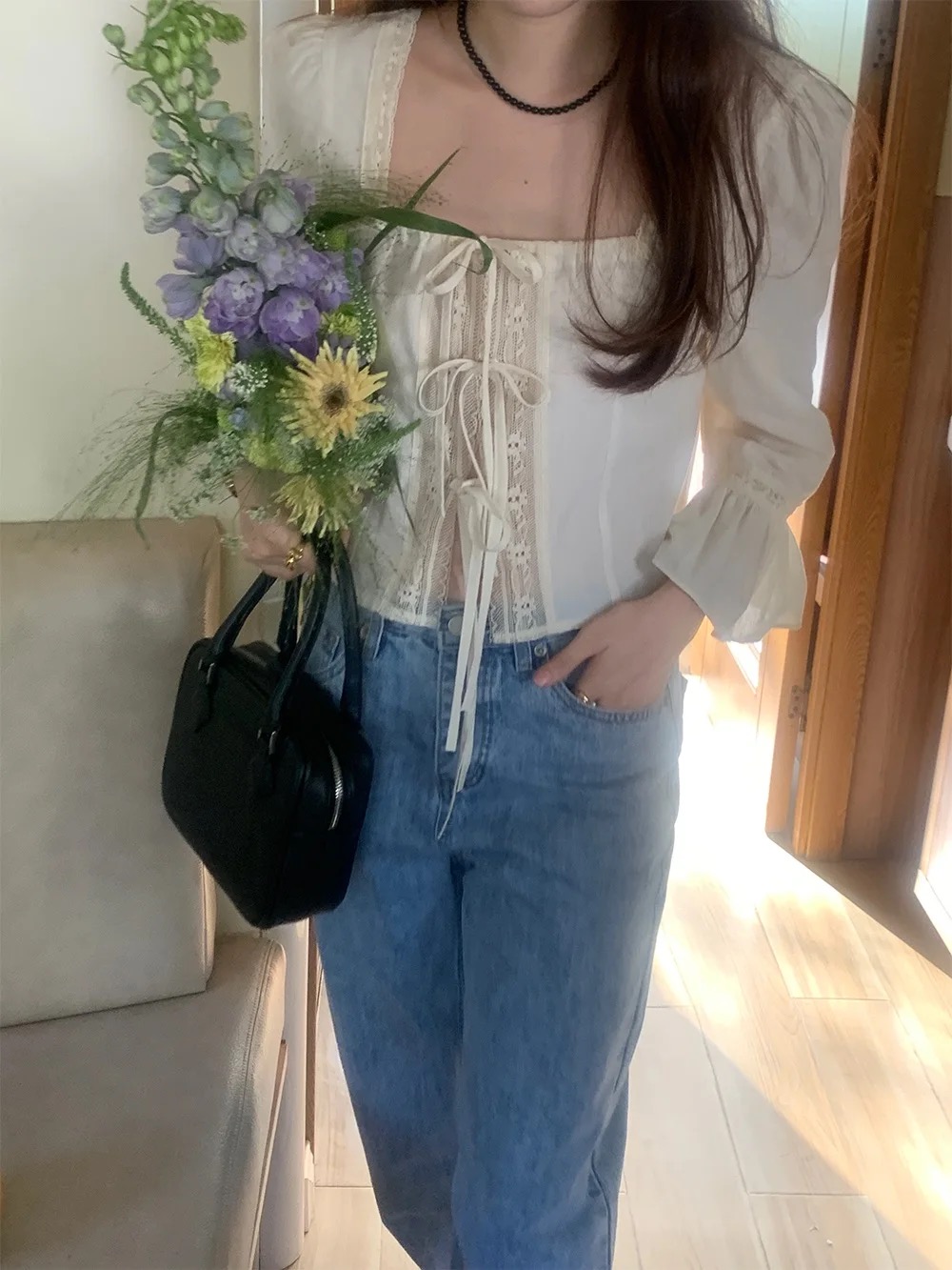 [여리핏/하객룩] 체토 긴팔 프릴 레이스 리본 발레코어 스퀘어넥 플레어 블라우스