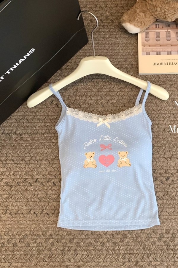 지아 곰 프린팅 레이스 스티치 캡내장 나시 탑