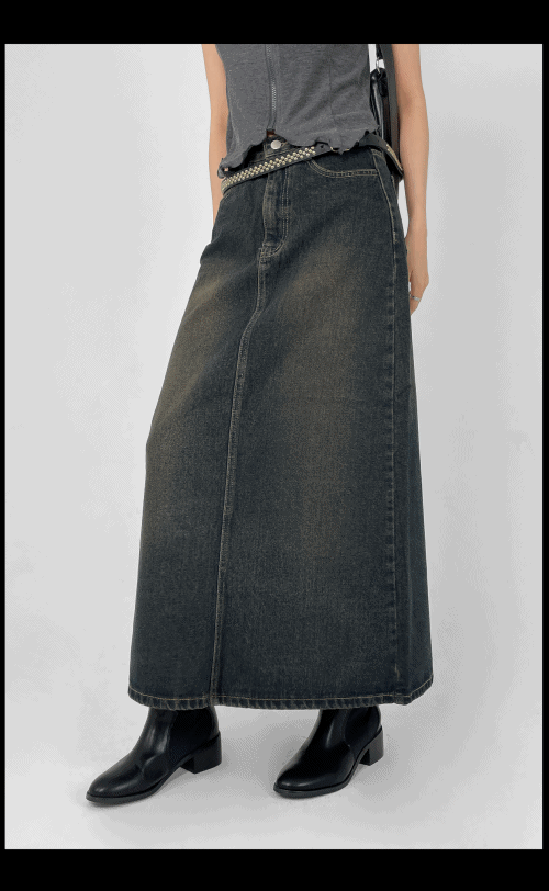 키시아 절개 워싱 청 데님 롱 치마 스커트