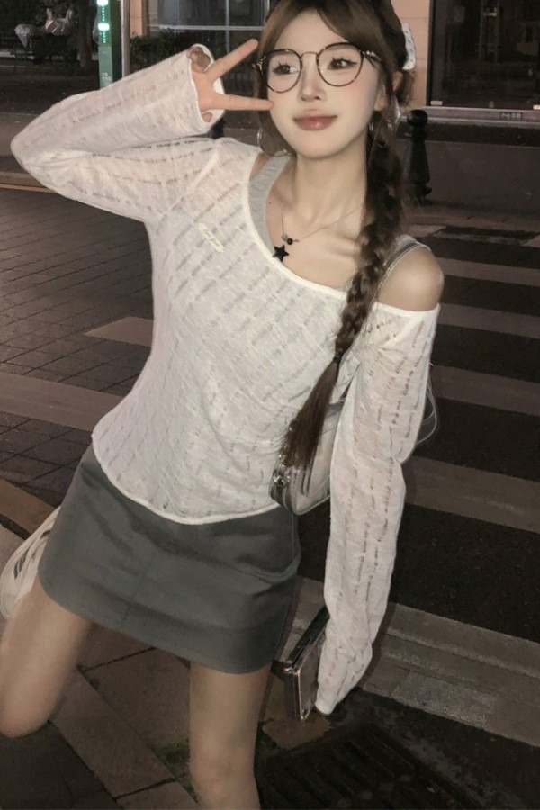 니아 오프숄더 페이크 두조각 긴팔 니트 스웨터