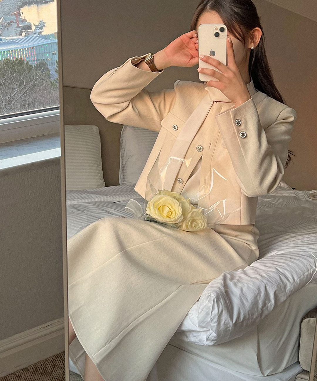 [MADE] 포르티 트위드 크롭 노카라 자켓 + 뒷밴딩 롱스커트set (44~100) (빅사이즈투피스-투피스셋업-트위트자켓-밴딩스커트-크롭자켓-하객룩-봄하객룩-출근룩-격식룩)
