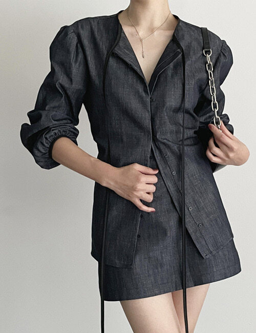 [논페이드] 라운지 생지 데님 퍼프 블라우스 [흑청]