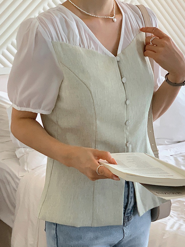 [44-120] 온드엔브 트위드 배색 쉬폰 블라우스 ( 여름-데일리룩-데이트룩-캐주얼룩-캠퍼스룩-하객룩-격식룩-출근룩-빅사이즈-120사이즈-자체제작-시원한-가벼운-통통녀-반팔블라우스 )