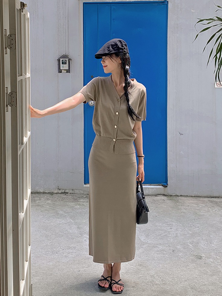 [44-120] 루드엔비 니트 브이넥 밴딩 투피스 세트( 여름-데일리룩-데이트룩-캐주얼룩-캠퍼스룩-하객룩-격식룩-출근룩-빅사이즈-120사이즈-자체제작-시원한-가벼운-통통녀-셋업-니트셋업-여름하객룩)