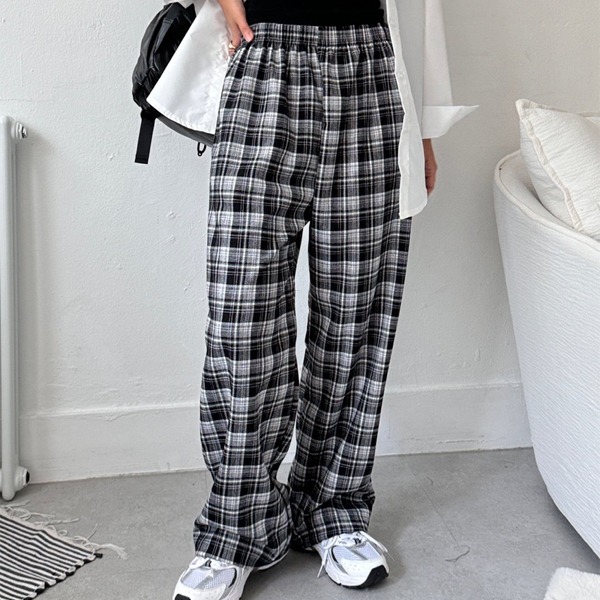 왓슨 체크바지)체크팬츠/체크패턴무늬/사각체크/허리밴딩/허리밴드/밤색/검정색/배색/편안한바지/츄리닝바지/와이드팬츠/통바지