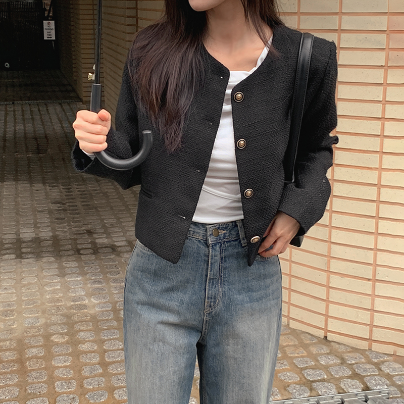 [단독] [3천장돌파🔥/크롭자켓] #MADE [tjk0374] 브리에 크롭 골드 라운드 자켓(하객룩자켓,노카라자켓,세미크롭자켓,라운드넥자켓)