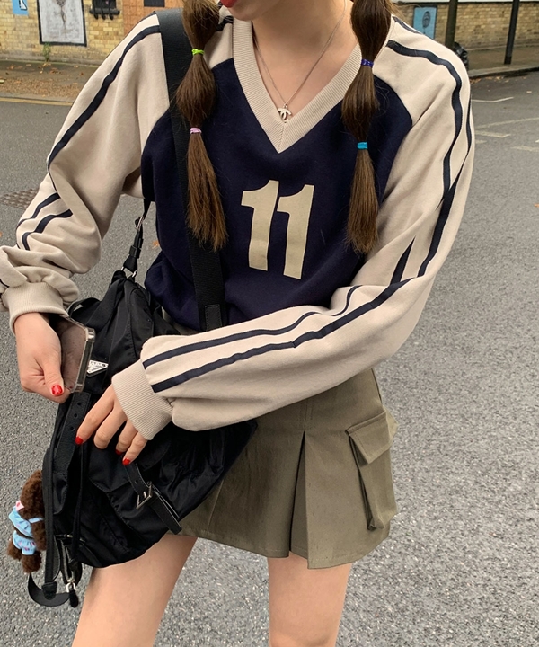 [가을신상🤎/따로또같이]일레븐 배색 트랙라인 맨투맨 + 카고 플리츠 스커트 2pc 코디세트
