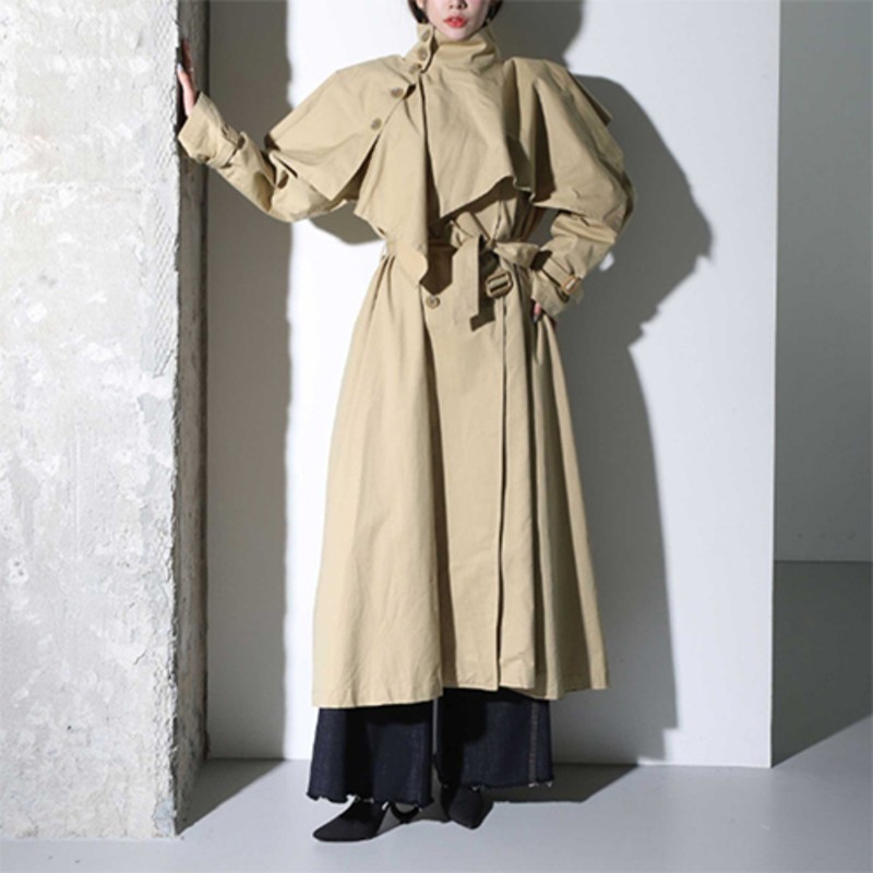 케이프 트렌치 코트 (유니크 프리미엄 가을신상 오버핏 투웨이 케이프세트 어깨패드 키큰여자 블랙 베이지 벨티드 A라인 맥시 롱 트렌치 롱 코트)