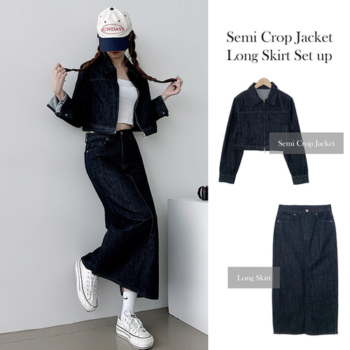 [투피스/1분코디!] 리펀 투웨이 카라 생지 데님 세미 크롭 자켓 + H라인 뒷트임 롱 스커트 set (2color)