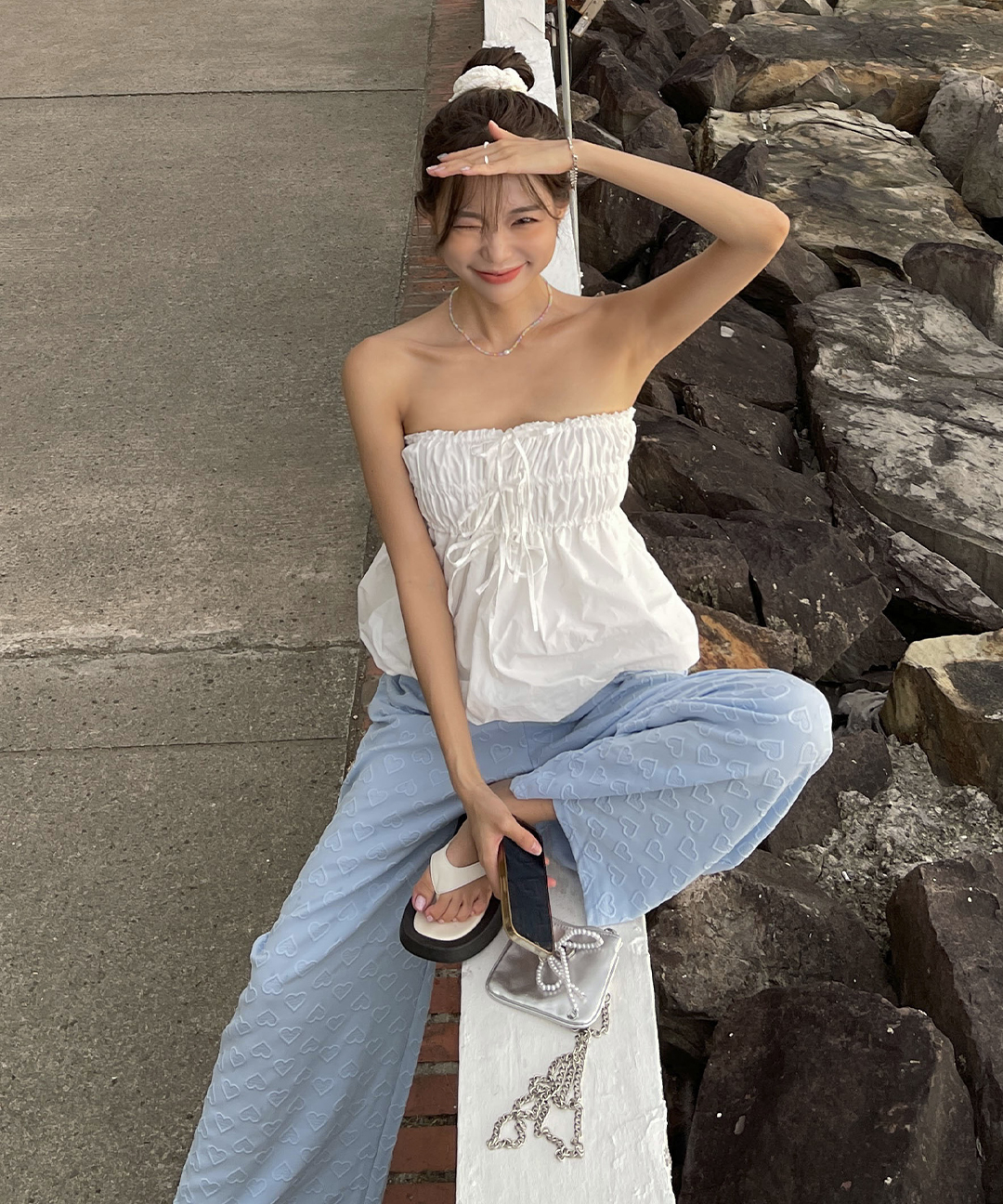 퍼드 바스락 벌룬 리본 스모크 튜브탑 리본 스트랩 셔링 밴딩 탑
