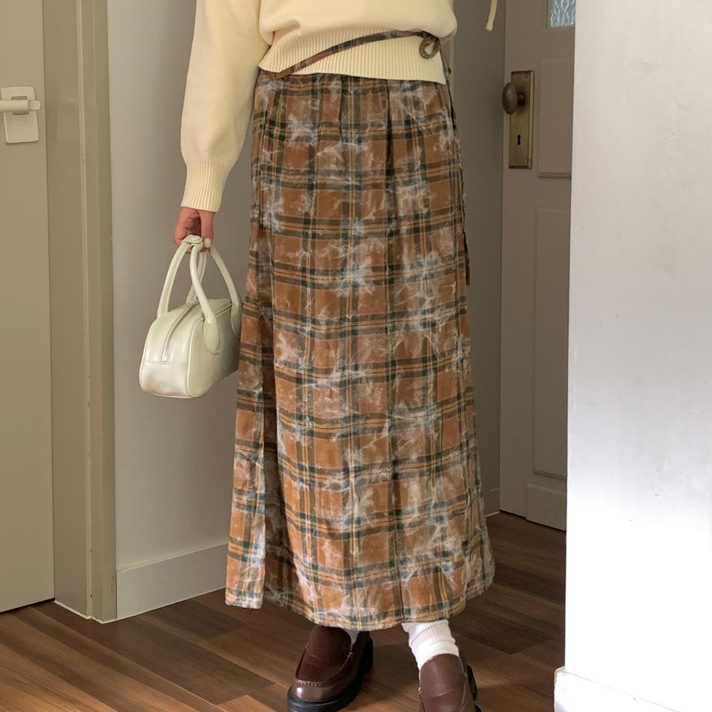 여자 물감나염 격자 리본 일본여행코디 FW 롱스커트
