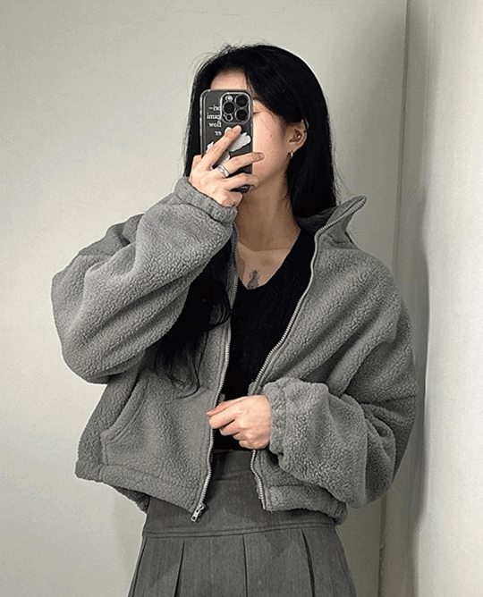 여성 양털 후리스 플리스 뽀글이 집업 점퍼 자켓 [2color 여자 크롭 하이넥 카라 잠바 세미크롭 간절기 봄 가을 겨울 아이보리 베이지 색 그레이 회색 긴팔 재킷 아우터 아웃터]