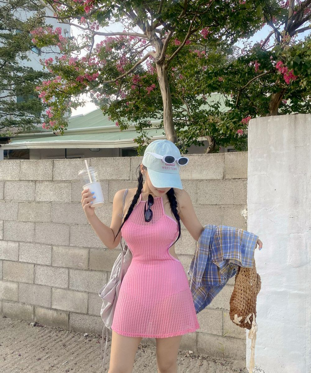 [반전뒷태/커플수영복할인] 피치크러쉬 홀터넥 옆트임 리본 니트 모노키니 원피스 수영복 (2 col)