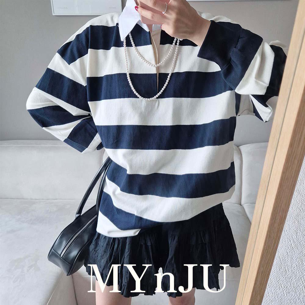 마이앤쥬 24FW 라비 가을 오버핏 럭비 폴로 스트라이프 박스 카라 피케이 티셔츠(3col)