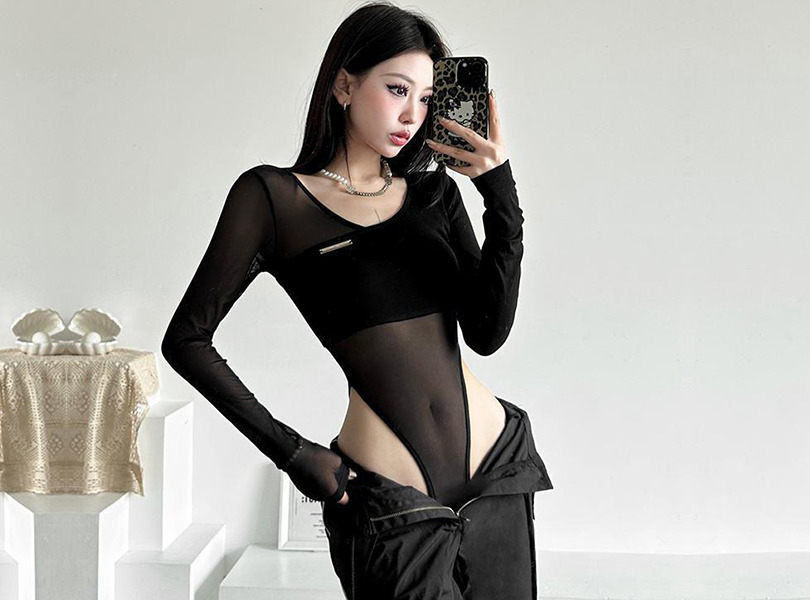[섹시미 뿜뿜 언발디자인!] 디토컷티 바디수트 시스루 긴팔 포인트 클럽 섹시 파티 블랙 트임 컷팅 무지 트렌디 힙스타일
