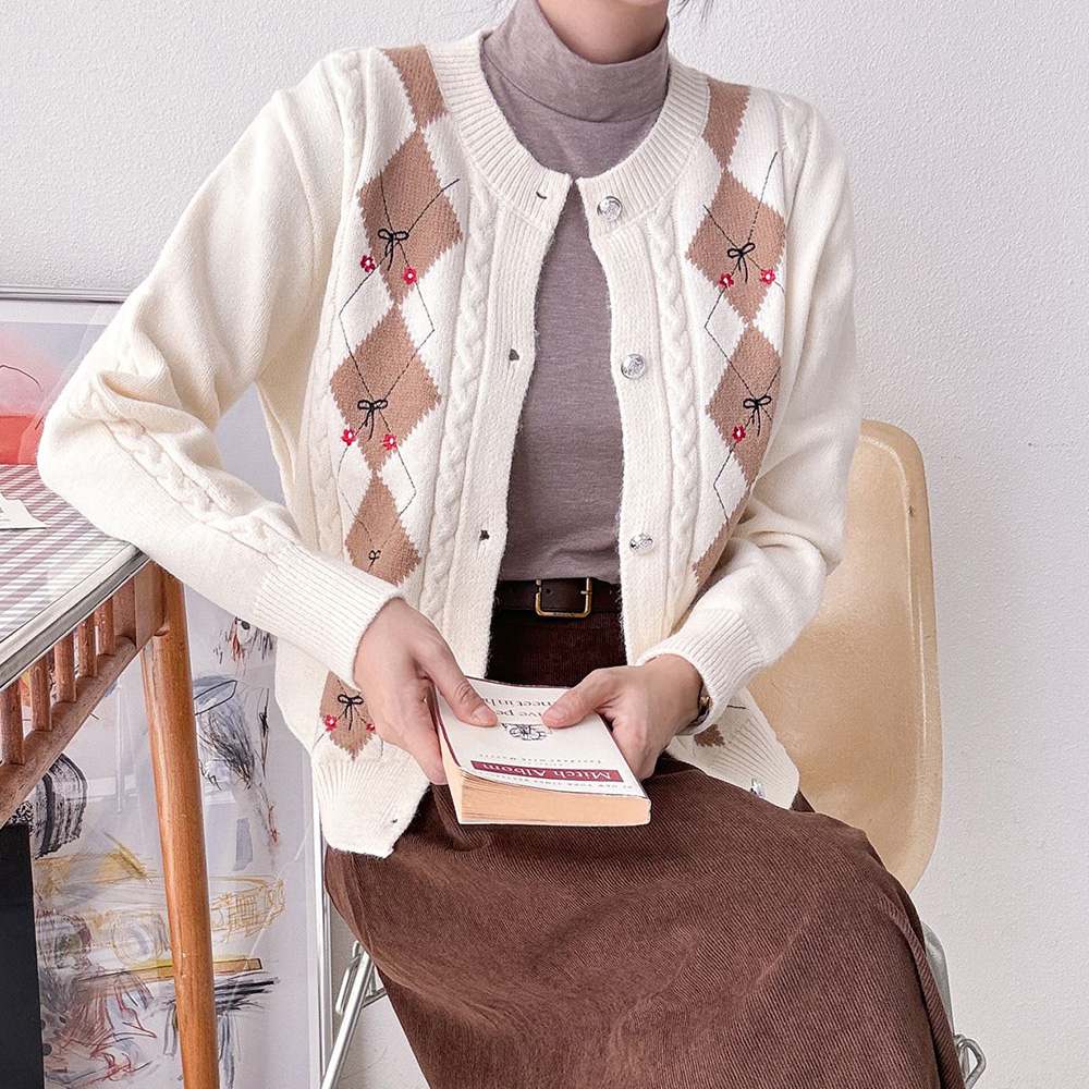 여자 키치 배색 아가일 체리 플라워 가을니트 가디건
