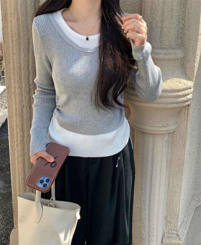 [당일출고] 하늘소 골지 긴팔 가을니트 니트탑 봄 이너 블랙 그레이 아이보리 배색 얇은 레이어드 라운드 니트 티셔츠