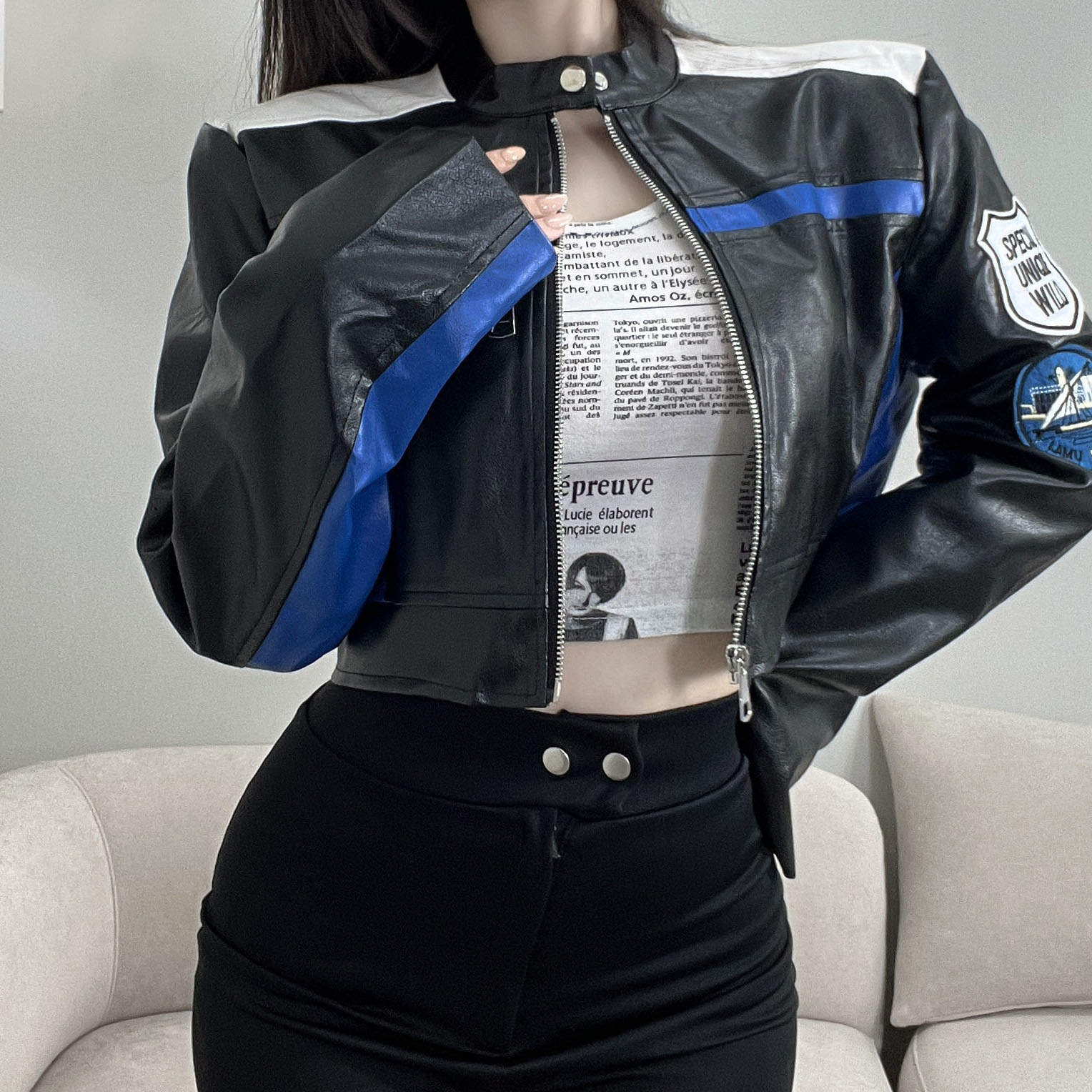 [무료배송❣][트렌디/1col] 배색 와펜 노카라 바이커 크롭 CROP 레이서 레더 자켓 스트릿 빈티지 Y2K 유니크 힙한 HIP (1color)