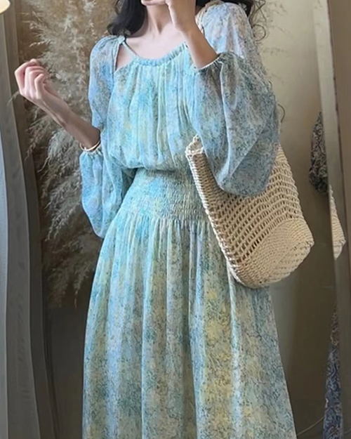 라운드넥 플라워 퍼프 롱 원피스 오웬롱원피스